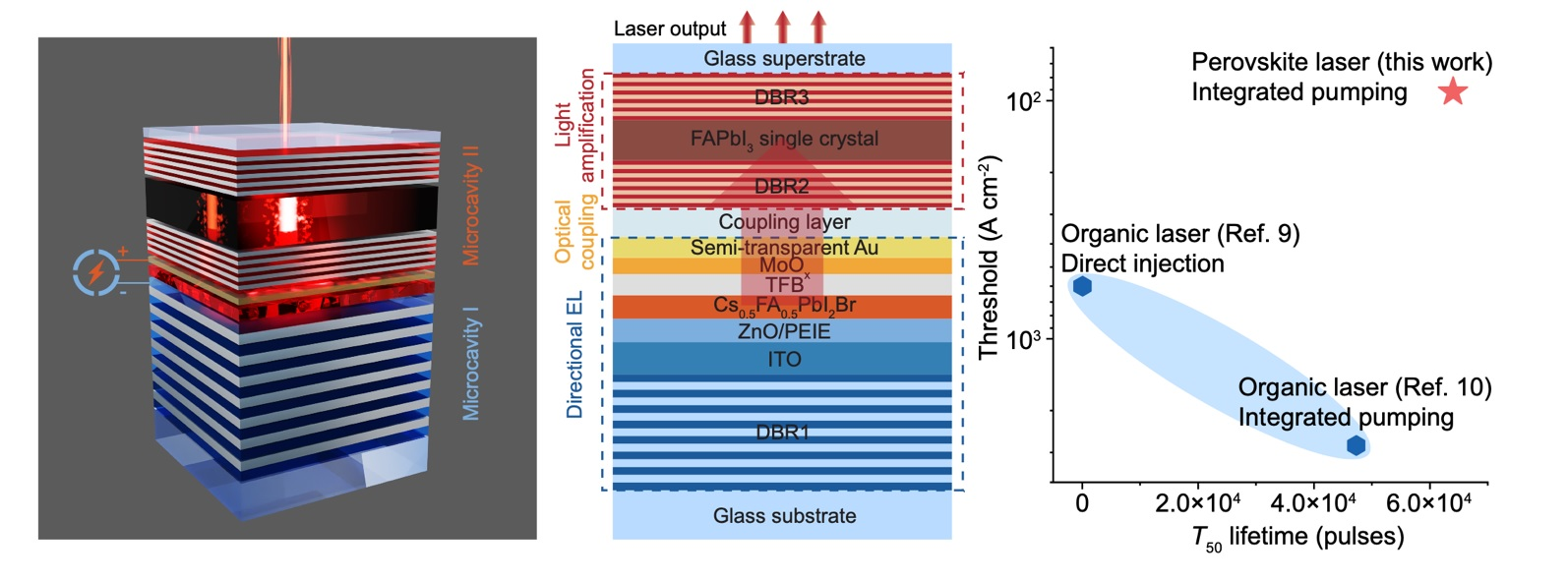 Zariadenie údajne efektívne spája veľké množstvo fotónov generovaných elektricky excitovanou mikrodutinovou perovskitovou LED do druhej mikrodutiny. Tam sú excitované monokryštálovým perovskitovým zosilňovacím médiom, ktoré generuje laser s väzbovou účinnosťou až 82,7 %. Štartovací prúd potrebný na spustenie tohto nového polovodičového lasera je 92 ampérov na štvorcový centimeter, čo je rádovo vyššia hodnota ako u najlepších elektricky poháňaných organických laserov, a vykazuje vynikajúcu stabilitu.