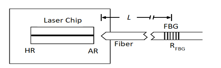 Konštrukcia externého dutinového lasera pomocou vláknovej Braggovej mriežky (FBG) je nákladovo efektívne riešenie na zvýšenie výkonu lacných laserov. Ako je znázornené na obrázku 1, FBG je vpísaný do vlákna vlákna, zvyčajne blízko emitujúceho čipu, čím sa vytvára laser s vonkajšou dutinou.