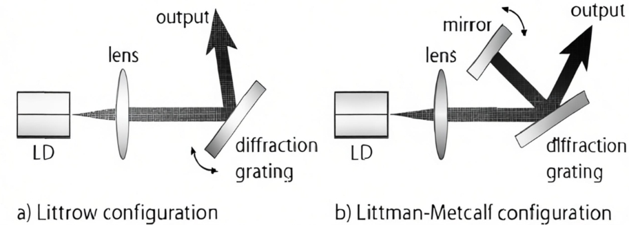 Lasery s krátkou dutinou, ako sú DFB a DBR, majú obmedzený čas interakcie fotónov vo vnútri dutiny, čo sťažuje kompresiu hlbokej šírky čiary. Na ďalšie stlačenie šírky čiary a potlačenie šumu sa takéto konfigurácie hlavnej dutiny s krátkou dutinou často kombinujú so štruktúrami s vonkajšou dutinou na optimalizáciu výkonu. Bežné štruktúry vonkajších dutín zahŕňajú priestorové vonkajšie dutiny, vonkajšie dutiny vlákien a vonkajšie dutiny vlnovodu. Pred vývojom zariadení s optickými vláknami a vlnovodných štruktúr boli vonkajšie dutiny prevažne zložené z priestorovej optiky kombinovanej s diskrétnymi optickými komponentmi. Medzi nimi priestorové spätnoväzbové štruktúry s vonkajšou dutinou založené na mriežke prijímajú najmä návrhy Littrow a Littman, ktoré zvyčajne pozostávajú z dutiny laserového zisku, spojovacích šošoviek a difrakčnej mriežky. Mriežka ako prvok spätnej väzby umožňuje ladenie vlnovej dĺžky, výber režimu a kompresiu šírky čiary.