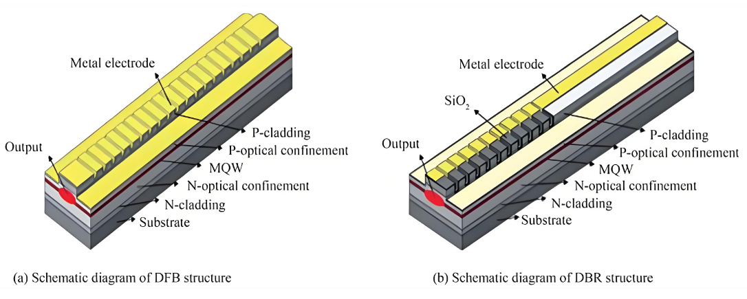Technická výzva laserov DFB spočíva vo výrobe mriežkových štruktúr. Existujú dve primárne metódy výroby mriežok v polovodičových laseroch DBR: sekundárna epitaxia a povrchové leptanie. Polovodičové lasery Regrown mriežka spätnej väzby (RGF)-DFB využívajú sekundárnu epitaxiu a fotolitografiu na rast sady mriežok s nízkym indexom lomu v aktívnej oblasti. Táto metóda zachováva štruktúru aktívnej vrstvy s nízkou stratou, čo uľahčuje výrobu rezonátorov s vysokým Q. Polovodičové lasery s povrchovou mriežkou (SG)-DFB zahŕňajú priame leptanie vrstvy mriežky na povrchu aktívnej oblasti. Tento prístup je zložitejší a vyžaduje presné nastavenie podľa materiálu aktívnej oblasti a dopingových iónov a vykazuje vyššiu stratu, ale ponúka silnejšie optické obmedzenie a vyššiu schopnosť potlačenia režimu.